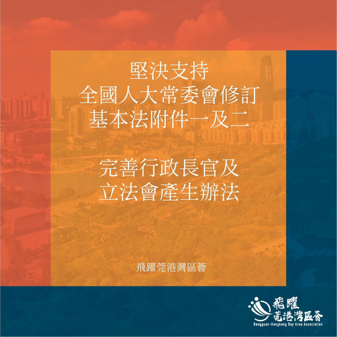 飛躍莞港灣區薈堅決擁護支持全國人大常委通過修訂基本法附件一和附件二,對香港特區實行新的民主選舉制度作出具體明確的規定。