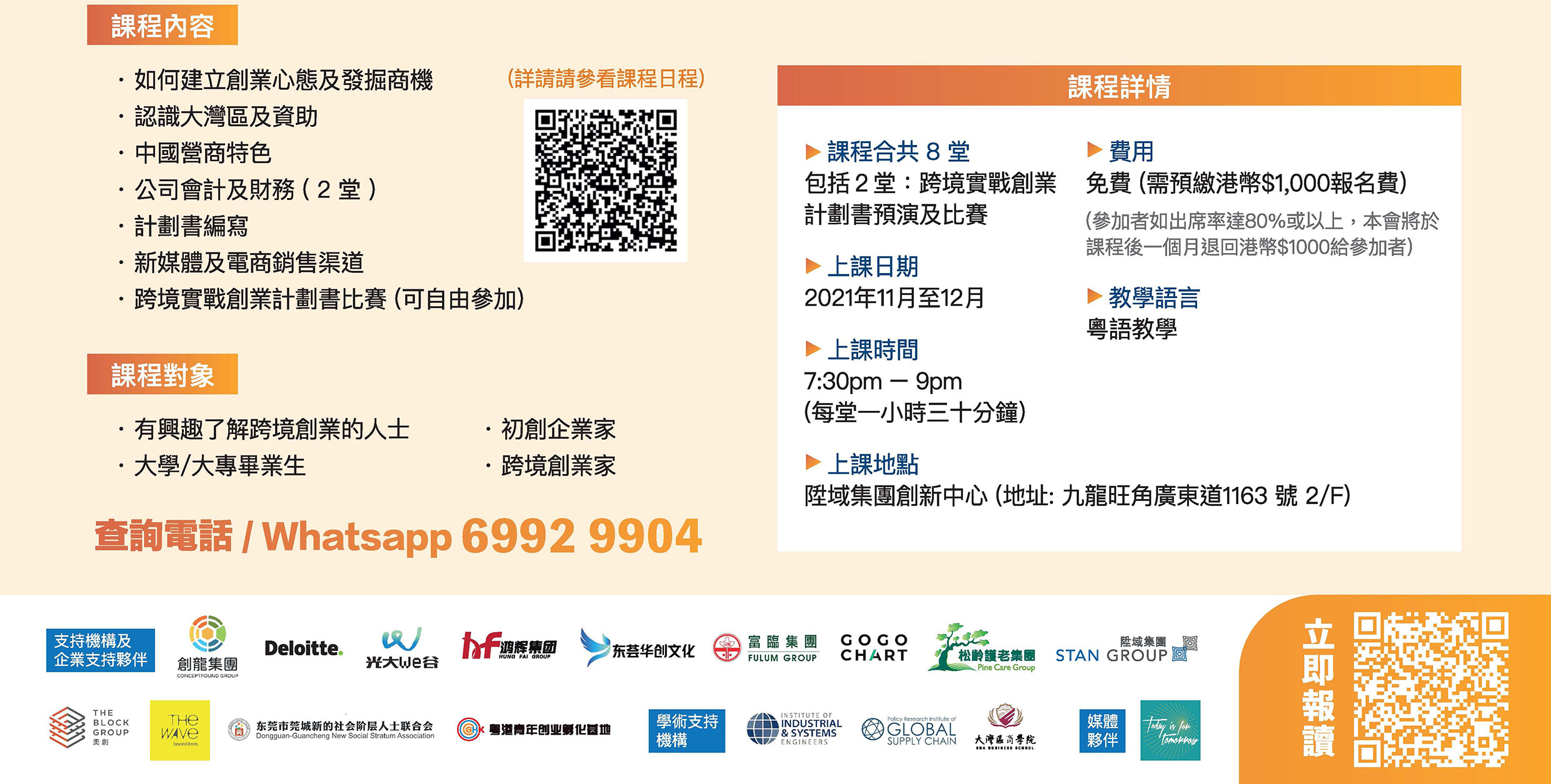 課程將全方位創業培訓作為基礎,涵蓋大灣區跨境營商的基本知識與資助政策簡介、內地營商特色、會計及財務、撰寫計劃書、線上銷售、市場推廣等實踐範疇。課程已邀請多位大灣區的成功初創企業家作導師,分享企業發展經驗及心路歷程,讓學員能充份掌握跨境營商的部署與實戰技能,提升企業發展優勢以至初創企業成功率。是次課程將包括撰寫創業計劃書並進行商務路演, 當中更會選出最優秀計劃書,第一名更可獲獎勵 。