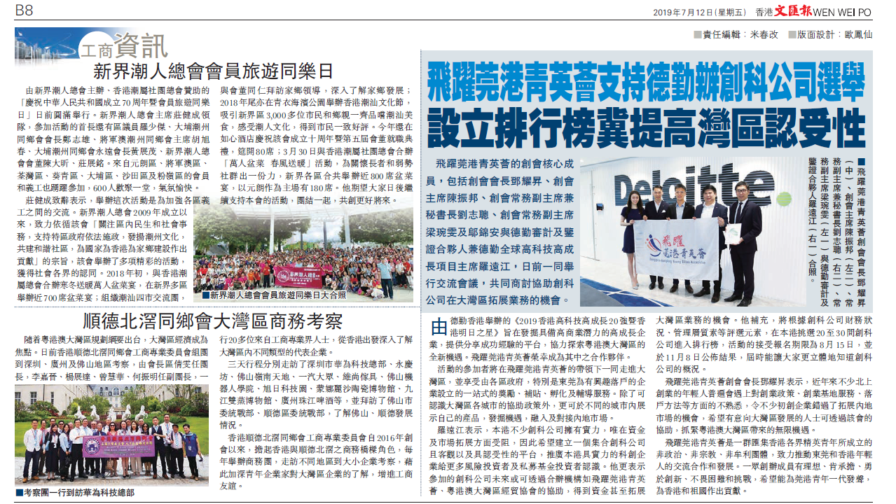 (香港,二零一九年七月八日) 2019 年 7月 5 日,飛躍莞港青英薈的創會核心成員,包括創會會長鄧耀昇先生、創會主席陳振邦先生、創會常務副主席兼秘書長劉志聰先生、創會常務副主席梁琬雯小姐及鄔錦安先生與德勤審計及鑒證合夥人兼德勤全球高科技高成長 專案主席羅遠江先生一同舉行交流會議,共同商討協助創科公司在大灣區拓展業務的機會。